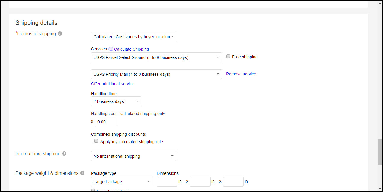 You continue to scroll down and select shipping options. For the most part, I always used flat rate shipping boxes or the padded flat rate envelope. The USPS will ship these boxes directly to you if you don’t have time to go in and pick them up yourself. If an item is smaller, you can choose regular priority mail. I still offered flat rate shipping options if possible so I’m not limiting myself to the lower 48 states. Shipping to Alaska and Hawaii is very expensive! You will also choose here if you only ship domestically or internationally. Some people are scared to do this because once it leaves the US, you cannot track it. I always ship internationally. It’s a risk, but I’ve actually had more issues with losing packages domestically than I did internationally!
