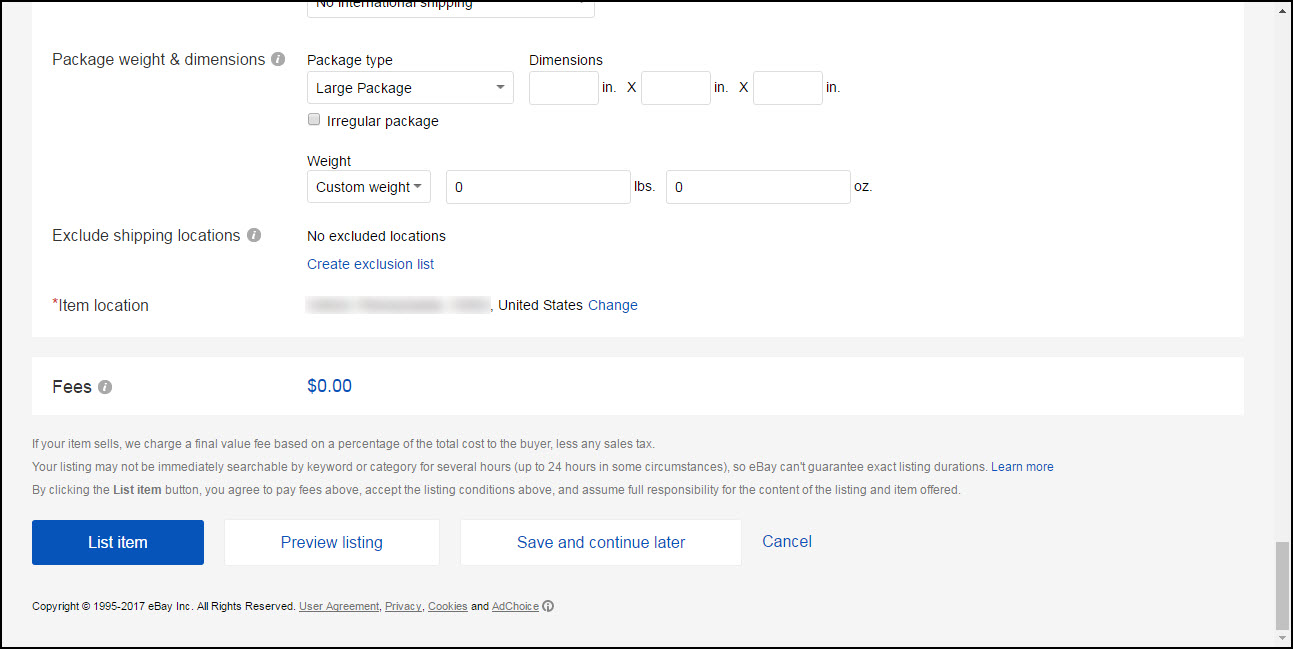 You will then finish up your shipping information and if you choose to create an exclusion list of where you won’t sell to. If you did “extras” for your listings, or you went over a number of free listings eBay gives you, your fees will be included at the bottom to review before you hit the button to list your item. You can also preview your listing, or save it and come back later to finish the listing. And of course, cancel the listing.