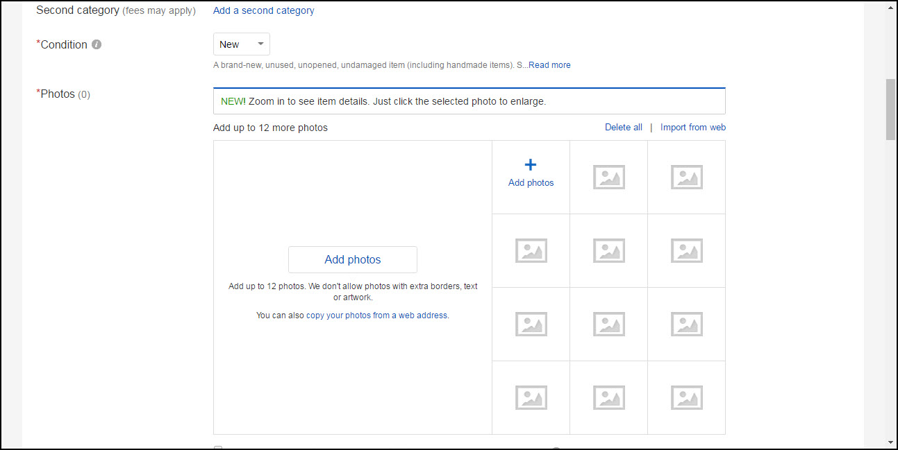 Step 7: You continue to scroll down and fill out the rest of the listing details. You will select if the item is new or used. Then insert up to nine photos. You want to get great shots and make sure you capture all the details: