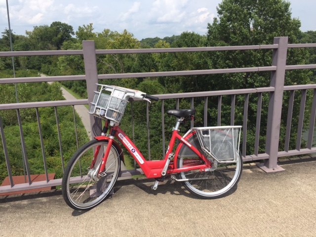 After we were done shopping, I was looking for how to get to the pedestrian bridge. Well, I put the wrong name in and we ended up at the Cumberland River Pedestrian Bridge. At first, we couldn’t figure out how to get to it, but we figured it out! Waze kept telling me we were at the destination but we were actually ABOVE it, lol. Got to the water park parking lot and we ended up renting bikes to get to the bridge. It was SO pretty when we got there!